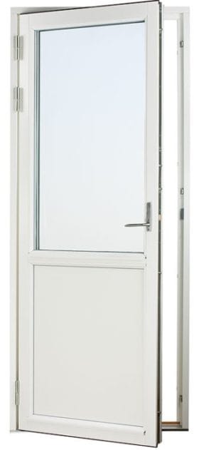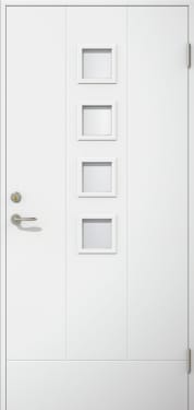 Vitmålad ytterdörr med glas. Alla fönster och dörrar levereras med utvändigt foder.