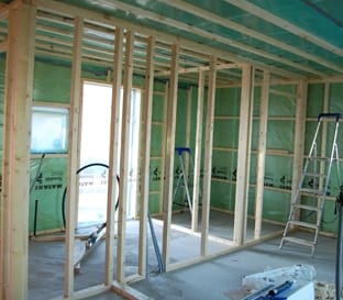 Innerväggar av färdig kapade 45×70 mm regler, löst 70 mm isoleringsmaterial och lösa gipsskivor till båda sidor. Innerdörrar vita släta storlek 90×210 cm exkl. trycke.