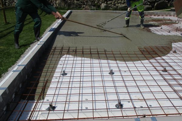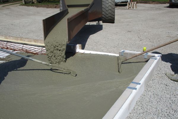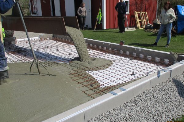 När betongbilen kommer är det viktigt att se till att betongen kommer hela vägen ut mot kanten av L-elementet/syllbalken. Undvik därför att spruta betongen på kantelementen utan rikta slangen inåt grunden och låt betongen rinna ut i kantbalken för att undvika att kantelementen rubbas.