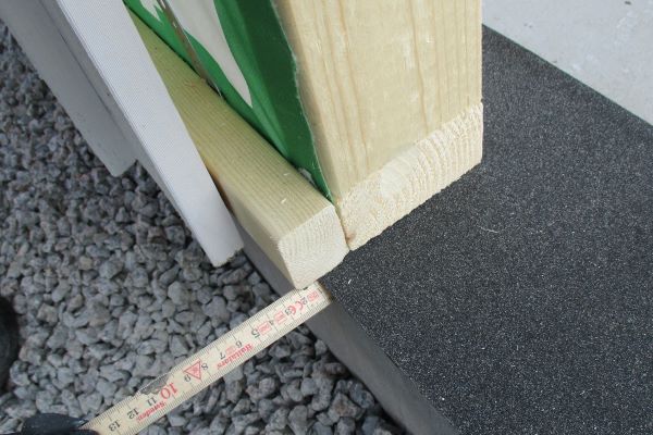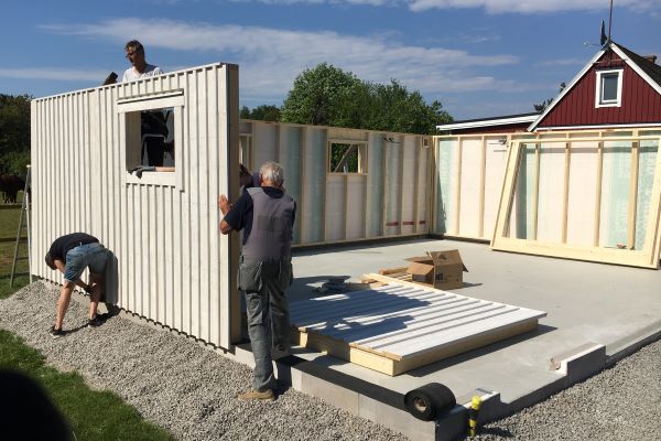 Väggarna ska delvis monteras utanför grunden. Glöm inte att lägga grundpapp mellan sockeln och väggarna.