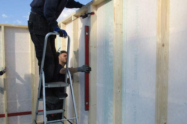 Sträva upp väggarna med bräder, så de står i våg och lod under det fortsatta monteringsarbetet.